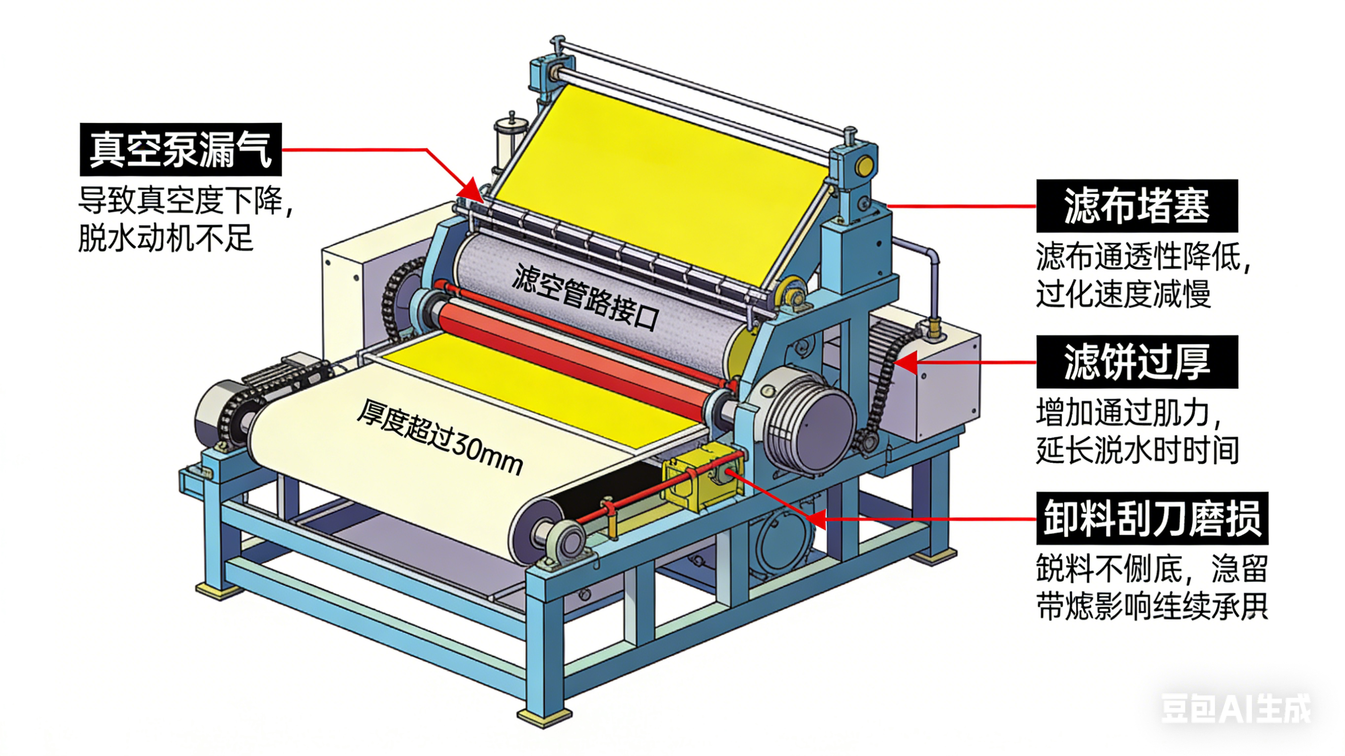 此外,濾餅厚度過厚(超過 25–30mm),真空吸力難以穿透濾餅深層,會出現(xiàn) “表層干、內層濕” 的情況。